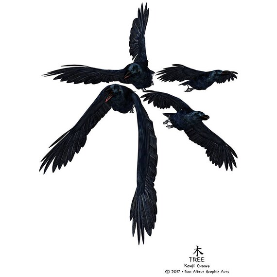 Tree Kanji Crows Japanese Chinese Asian Calligraphy Characters Birds Flight Flying Feather Orient